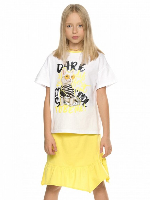 Комплект для девочек футболка и юбка. Футболка актуального мягкого оверсайз силуэта со спущенным плечом. Фотопринт и текстовый неоНовый принт с серебряным металликом и глиттером, перевод Осмелься быть другой. Это круто быть мной.. Юбка  Новинка. Умеренный объем, по низу юбки пришит фигурный волан. Пояс на комфортной внутренней резинке.