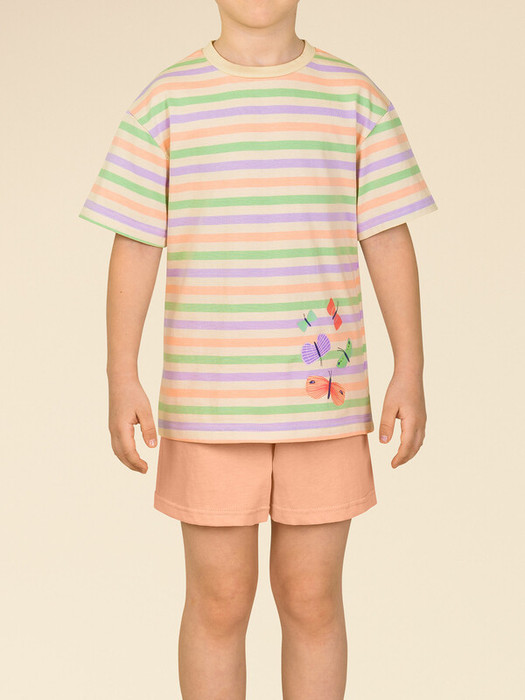 Стильная и уютная пижама в нежных пастельных оттенках для девочки. В составе ткани 100% хлопка — идеально для детской одежды! Модель приятна на ощупь, прекрасно пропускает воздух, позволяя коже ребёнка дышать. При этом в пижаме из хлопка ребёнку будет уютно, даже если он сбросит одеяло. Всё это обеспечивает комфортный и качественный сон. Свободная футболка и комфортные шорты, плечо немного спущено, рукава широкие — в пижаме очень удобно спать. Широкая и мягкая резинка в поясе не перекручивается и не давит. Отделка горловины из эластичной рибаны — она не растягивается, ребёнку удобно надевать и снимать пижаму. Шорты однотонные, персикового цвета. Футболку в полоску украшает милый принт в виде бабочек. В линейке представлены детские пижамы следующих размеров: 1 (86); 2 (92); 3 (98); 4 (104); 5 (110); 6 (116), 7 (122); 8 (128); 9 (134); 10 (140); 11 (146). Хлопковый комплект идеален для сна и отдыха дома — прекрасный выбор для вашего ребёнка! Пижама с шортами для девочки подходит для круглогодичного использования. Домашний комплект — замечательный подарок дочке, внучке, сестре на любой праздник. Выбирайте нужный размер по таблице размеров на фото. Цвет товара на экране вашего устройства может отличаться от цвета изделия вживую.