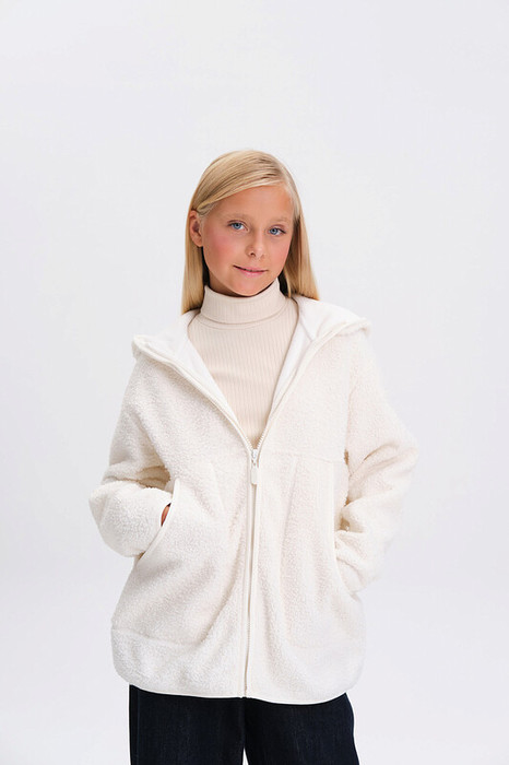 Флисовая кофта для девочки. Толстовка из мягкого, тактильно приятного берберфлиса (фактура «барашка») поможет создать «няшный» образ. Худи на замке умеренного оверсайз-силуэта подойдёт девочкам с любой фигурой. Капюшон двухшовный — это обеспечивает анатомически правильную форму и комфортную посадку по голове. Флиска застёгивается на удобную центральную молнию. По низу изделия также есть утяжка. Модель выполнена из 100% полиэстера — она лёгкая, мягкая, износостойкая, просто стирается и быстро сохнет. По переду кофта детская дополнена карманами, их округлые контуры обработаны декоративной строчкой — актуальный модный приём. Пушистая толстовка выполнена в универсальном цвете, который легко сочетаются с одеждой разных цветов.Плюшевая толстовка неприхотлива в уходе. Помните о правильном уходе за изделием: рекомендуется стирать при температуре не выше 30 °C, без предварительного замачивания, с изнанки. Это поможет сохранить качество и цвет куртки на длительное время.
