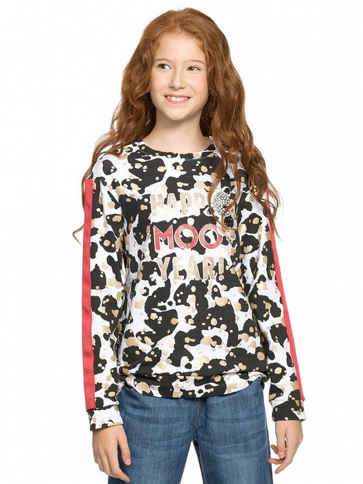 Свитшот из хлопкового футера с эластаном. Манжеты из основной ткани. Алловер и glossy rubber принт с золотом и разноцветным глиттером.  Яркие лампасы из репсовой тесьмы с люрексом. Перевод Счастливого МУУ года.