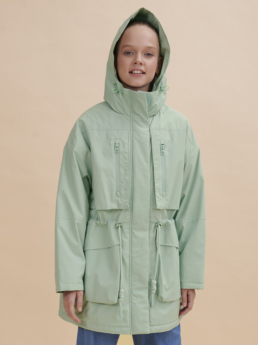 Парка для девочки с температурным режимом не ниже +5°С прямого свободного силуэта. Мягкий оверсайз. Ветровка на флисовом подкладе (верх переда и спинки, подклад капюшона из флиса, а нижняя часть переда и спинки и подкладка рукава из 100% POLY + синтепон 40г/м2 ). Мембранная ткань хорошо защищает нижние слои одежды от намокания. Структура мембранной ткани позволяет коже дышать - ребенок легко двигается и не переохлаждается. Изделие сохраняет первоначальный внешний вид даже при активной носке. Водоотталкивающая пропитка или  DWR (Durable Water Repellent) – «устойчивое водоотталкивающее покрытие» - защищает от промокания под дождем: материал не утяжеляется под воздействием влаги, позволяя свободно пропускать воздух.  Низ рукава прямой, внутри рукава расположена скрытая манжета из мягкой эластичной ткани.
