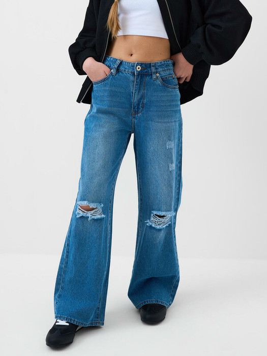 Широкие джинсы wide leg для девочки подростка. Застежка на молнию и болт, пояс дополнительно регулируется внутри с помощью эластичной тесьмы и пуговицы. Изделие выполнено из светло-голубого денима с характерными потертостями и прорезями на передней части. Джинсы имеют свободный крой с прямыми широкими штанинами и посадку на талии. Спереди — два кармана, сзади — два накладных кармана. На одном из них — этикетка с надписью.