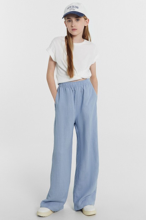 Брюки для девочек широкие. Посадка высокая. Пояс цельнокроеный из основного полотна, застрочен с эластичной тесьмой RV40 внутри, по поясу проложены отделочные строчки. В боковых швах обработаны карманы. Низ брюк обработан швом в подгибку.