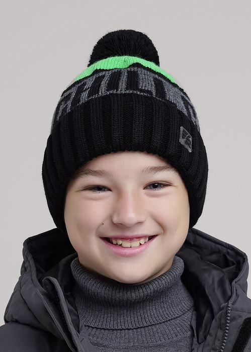 Шапка детская с отворотом и ниточным помпоном, с утеплением флисом по всей голове. Выполнена из высококачественной пряжи, декорирована стильной нашивкой в височной зоне. Станет не только отличной защитой от холода, но и модным аксессуаром.