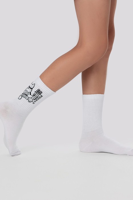 Высокая резинка бережно фиксирует носок, не сползая и не сдавливая ножку, а забавный рисунок кота в стиле карате с иероглифами делает их стильным дополнением любого образа.