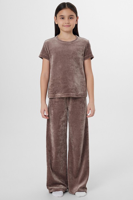 Джемпер прямого силуэта. Горловина круглой формы, обтачка из основного полотна . Рукава втачные свободные. Низ рукавов и низ джемпера в подгибку. Брюки свободного силуэта. Пояс цельнокроеный внутри с резиной 40RV. Низ брюк в подгибку.