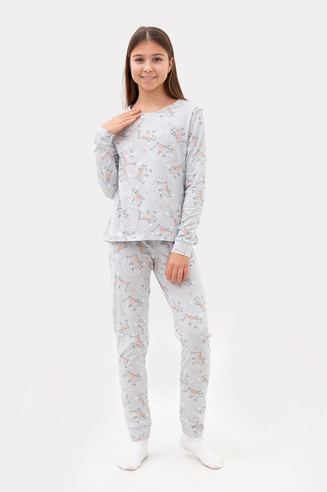 Уютная хлопковая пижама для девочки. Широкие эластичные манжеты на рукавах лонгслива и штанинах брюк. Интересный симпатичный дизайн. Продуманная конструкция. Идеальный вариант для приятного сна и расслабленного отдыха
