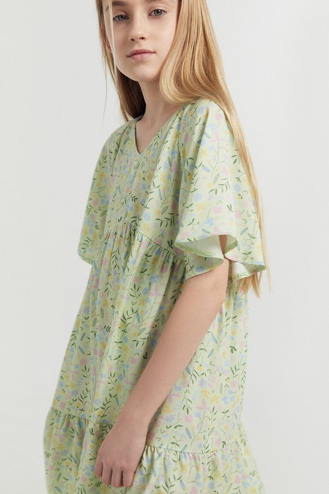 Платье А-силуэта с отрезными воланами. Треугольный вырез горловины обработан бейкой из основного полотна в чистый край. Короткие рукава-крылышки покроя реглан. Низ лифа фигурный. По переду лифа пришиты три пуговицы в качестве декора. Низ изделия и рукавов обработаны швом вподгибку.