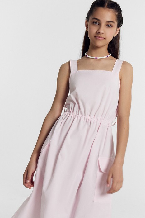 Платье для девочек свободного силуэта на бретелях. По спинке верхнего края платья внутри эластичная тесьма RV20. Платье отрезное по талии, с кулиской. В ней пробиты петли и протянута эластичная тесьма SFKR-1, с фиксаторами SFFKR-1, образуют сборку. По боковым швам накладные карманы с клапаном. Низ платья обработан швом вподгибку.