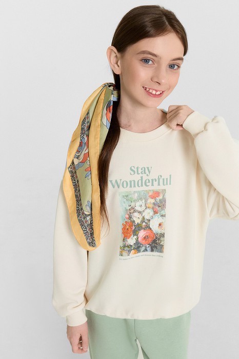 Джемпер свободного силуэта. Рукава длинные, втачные. Линия плеча спущена. Перед и спинка цельнокроенные. Горловина круглой формы обработана обтачкой из рибаны. По низу рукавов и джемпера притачены манжеты и пояс из рибаны.