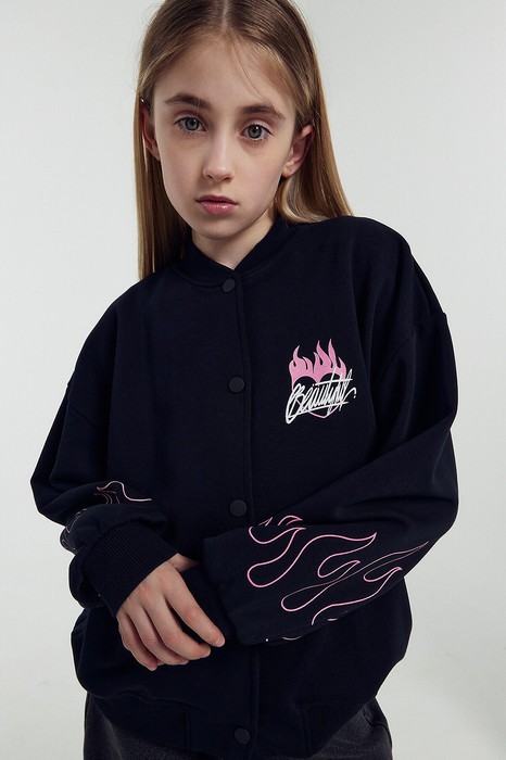 Жакет свободного кроя. Боковые швы к низу перенесены вперед. Круглый вырез горловины. В горловину втачан воротник-стойка из рибаны. Плечо спущено, пройма углубленна. Рукава втачные, длинные. По низу рукавов манжеты из рибаны. В боковых швах карманы . По низу изделия отрезной пояс из рибаны.
