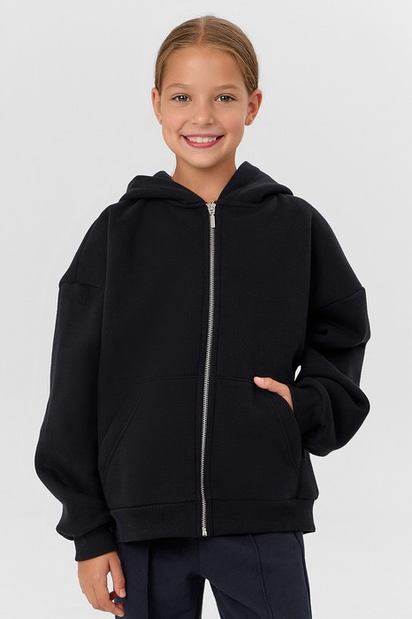 Толстовка свободного силуэта, с капюшоном. Горловина округлой формы. Капюшон на подкладке из основного полотна. Рукава втачные длинные, плечо спущено. По низу рукава отрезная манжета из рибаны. Центральная застежка на тесьму молнию. По переду накладные карманы кенгуру. Пояс отрезной из рибаны.