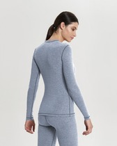 Женский облегающий боди. Втачной длинный рукав. Воротник стойка. Застежка в паховой части на крючки.