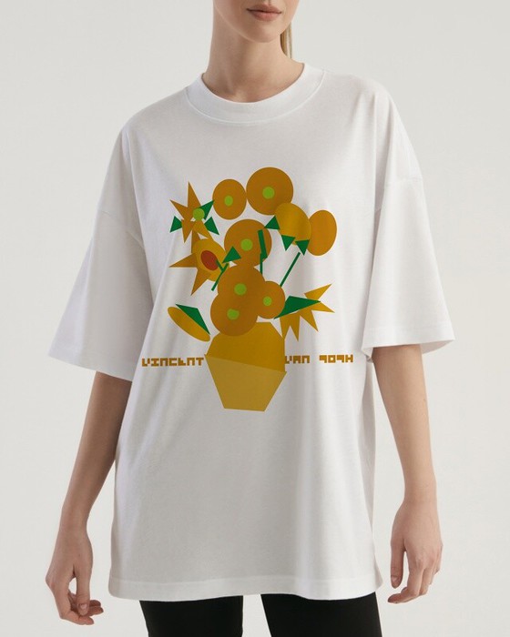 Футболка свободного силуэта. Спущенное плечо. Горловина из двух деталей, из рибаны.