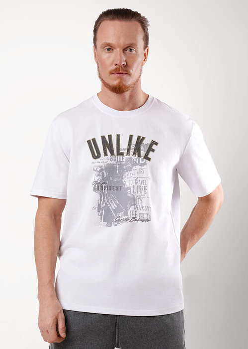 Футболка мужская, увеличенного объема, из хлопкового полотна, круглым вырезом горловины и втачным рукавом. Оригинальность изделию придает дизайнерский принт. Отличный вариант на каждый день.
