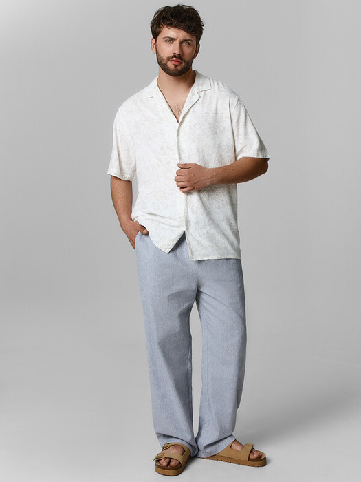 Брюки прямые, посадка средняя. Пояс отрезной с эластичной тесьмой внутри. По переду пробиты петли и втянут шнур-бейка из основного полотна с застроченными концами. В боковых швах обработаны карманы. По переду обработан гульфик с супатной застежкой на петли и пуговицы. На задней правой половинке накладной карман. Нижние срезы брюк обработаны швом вподгибку.