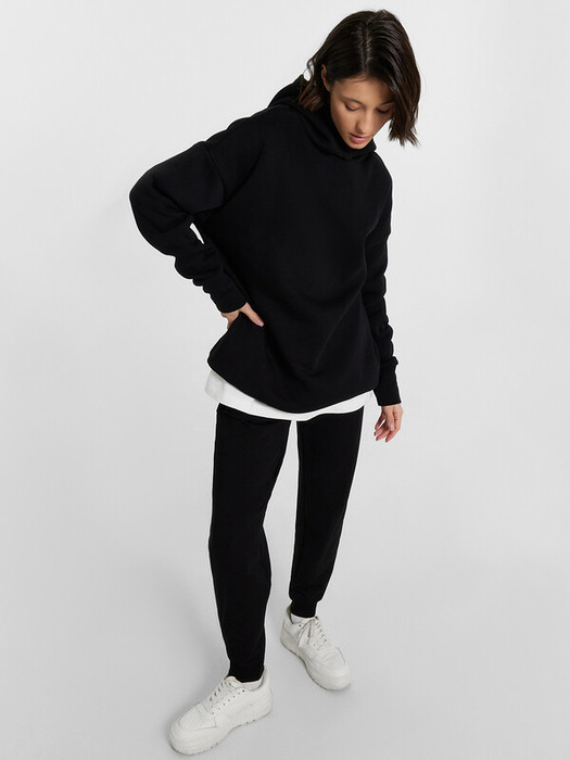 Брюки изготовлены из трикотажного полотна футер. Брюки прямые с высокой посадкой. Пояс отрезной из рибаны с эластичной тесьмой внутри. В передней части пояса с лицевой стороны пробиты петли и втянут шнур. Шов втачивания пояса распошит. Спереди обработаны карманы хулиганы. По низу брюк отрезные манжеты из рибаны.