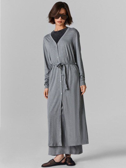 Кардиган свободного силуэта, с поясом и петельками из основного полотна. Плечо спущено, рукав втачной, длинный.