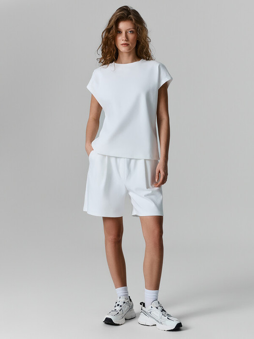 Шорты свободного силуэта, выше колена. По переду заложены складки. По бокам карманы с отрезным бочком. Пояс отрезной, с внутренней резиной 40RV и круглым шнуром 8мм с метал. эглетами (8NMKXWC-1). Низ изделия вподгибку.