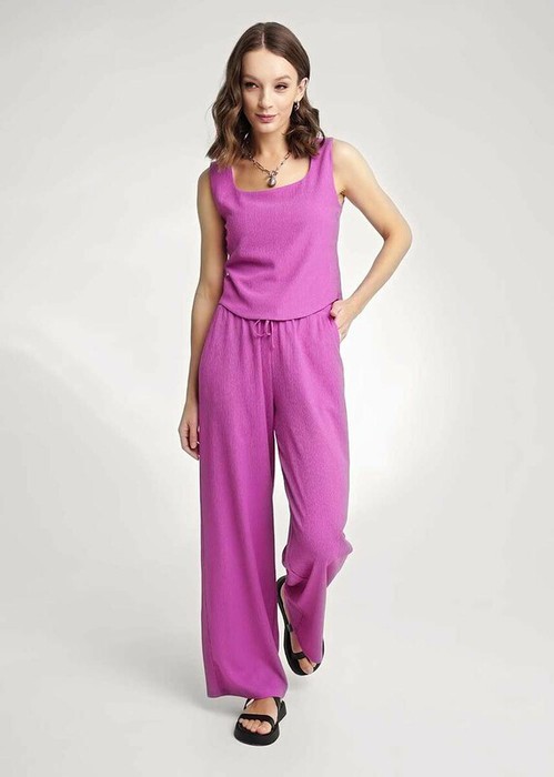 Брюки широкие из трикотажного полотна джерси. По талии притачной пояс на внутренней резинке со шнуром из основного полотна. Боковые карманы с отрезным бочком.
