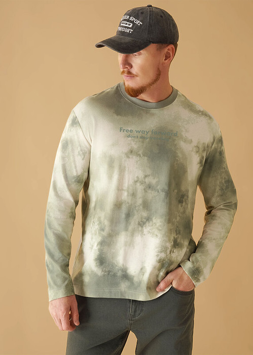 Стильный мужской джемпер в хаотичную набивку из хлопкового трикотажного полотна. Изделие с круглым вырезом горловины и длинным рукавом. Модель дополняет принт и имиджевая фурнитура. Идеальный вариант для повседневного использования.