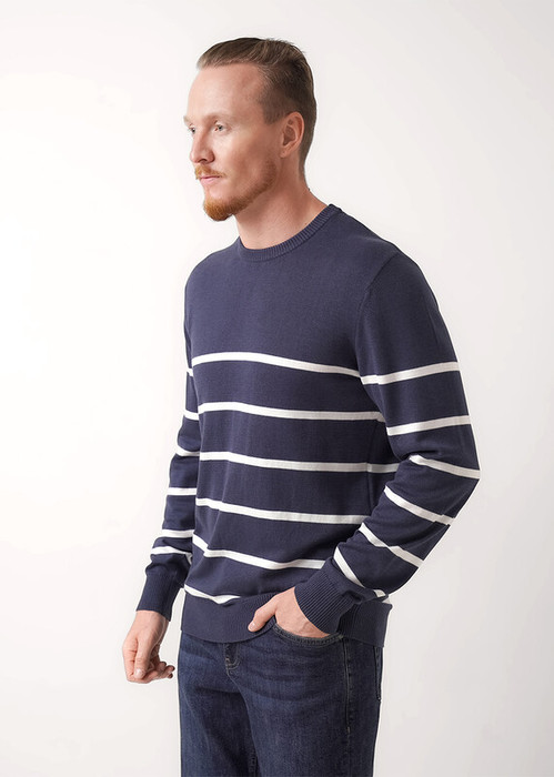 Джемпер мужской в полоску из смесовой хлопковой пряжи с длинным рукавом и круглой горловиной. Прекрасно сохраняет тепло, комфортный в носке, отличное решение на холодное время года. Комбинируется с джинсами или брюками.