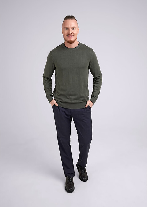 Классический вязаный джемпер с круглой горловиной. Изделие изготовлено из смесовой пряжи с содержанием хлопка. Данный джемпер удачно впишется в повседневный гардероб современного мужчины, привнося тепло, комфорт и элегантность одновременно.