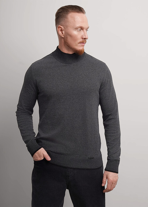 Джемпер мужской из смесовой хлопковой пряжи с длинным рукавом и воротником стойкой. Прекрасно сохраняет тепло, комфортный в носке, отличное решение на прохладное время года. Комбинируется с джинсами или брюками.