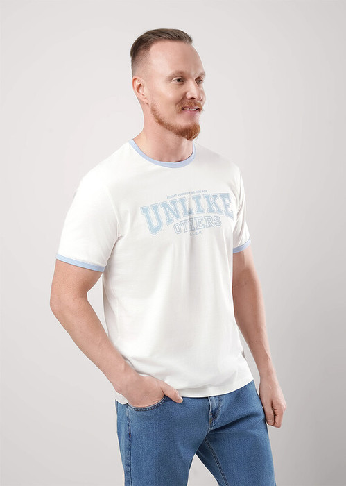 Футболка мужская из дышащего хлопкового полотна. Модель с контрастным круглым вырезом горловины и манжетами. Прекрасно сочетается с джинсами или шортами. Дополнена принтом.