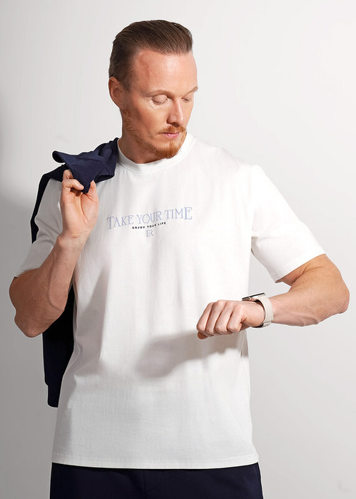 Футболка из дышашего хлопкового полотна. Звучание модели придает авторский шрифтовый принт. Отличный вариант для динамичных мужчин.