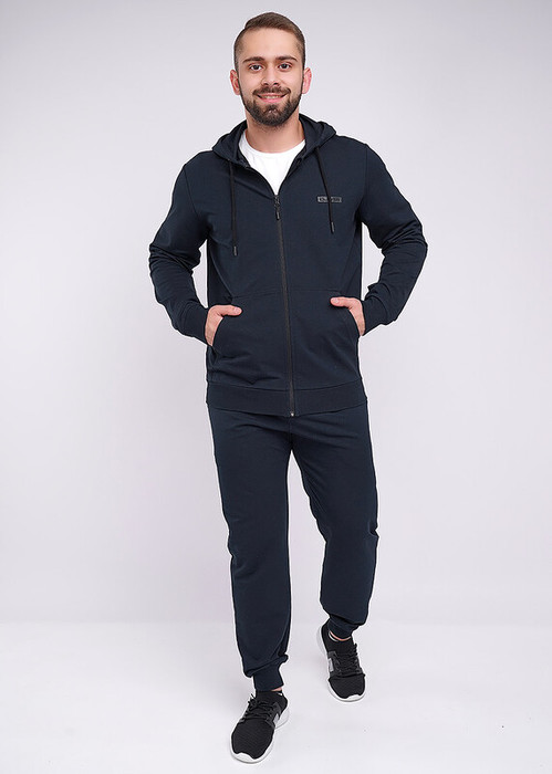 Модная куртка с капюшоном на молнии из плотного трикотажного полотна будет незаменимой вещью в гардеробе любого мужчины, благодаря функциональным карманам "кенгуру" и стильной отделке в виде нашивок.