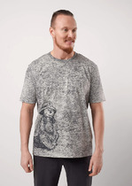 Фуфайка с коротким рукавом среднего объема, с оригинальным принтом, круглым вырезом горловины, которая оформлена обтачкой из рибаны.