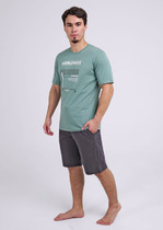 Футболка свободного покроя с круглым вырезом, на глади с авторским прином. Шорты комфортной посадки с поясом на внутренней резинке с карманами.