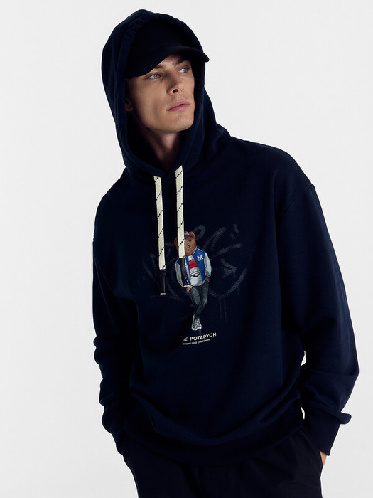Мужское худи свободного силуэта из трикотажного футера без подчеса. Круглая горловина с капюшоном, длинные рукава на манжетах, слегка спущенная линия плеча, пояс из рибаны – худи удачно сочетает комфортный дизайн и отличное качество!