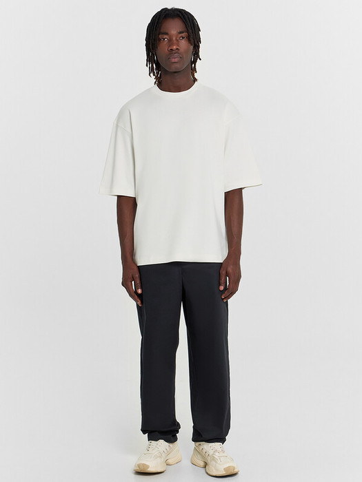 Брюки прямые, посадка средняя. Пояс цельнокроёный с эластичной тесьмой внутри. С внутренней стороны пробиты петли и втянут шнур с застроченными концами (10PXC-1). На левой детали переда имитация гульфика.  По переду карманы с отрезными бочками. Нижние срезы брюк обработаны швом вподгибку. На деталях спинки накладные карманы.