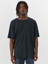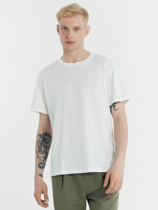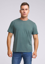 Футболка мужская свободного силуэта из трикотажного полотна кулирка. Горловина круглой формы, обтачка из рибаны. По горловине проложена отделочная строчка. Бейка по горловине спинки из кулирки. Рукав втачной, короткий.