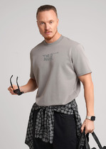Футболка прямая свободная. Горловина округлой формы обработана обтачкой из рибаны. Линия плеча слегка спущена. Рукава втачные, корткие. Нижние срезы футболки и рукавов обработаны швом вподгибку на 2х шовной плоскошовной машине.