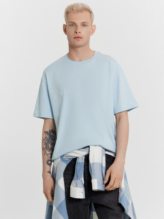 Футболка свободного силуэта. Перед и спинка цельнокроеные. Горловина круглой формы. Обтачка горловины из рибаны 1*1. По горловине проложена отделочная строчка. Горловина спинки закрыта тесьмой из основного полотна. Плечо спущено, пройма углублена. Рукав втачной, длина рукава чуть выше локтя.