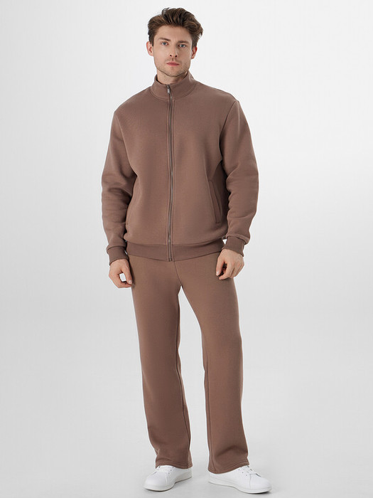 Жакет изготовлен из трикотажного полотна футер 3х нитка с подчесом. Жакет прямого силуэта свободный, длиной до середины бедер. Горловина округлой формы с воротником стойкой из основного полотна. Рукава втачные, длинные с отрезными манжетами. По переду обработаны прорезные карманы с листочкой. Центральная застежка на тесьму молнию. Пояс и манжеты - рибана.