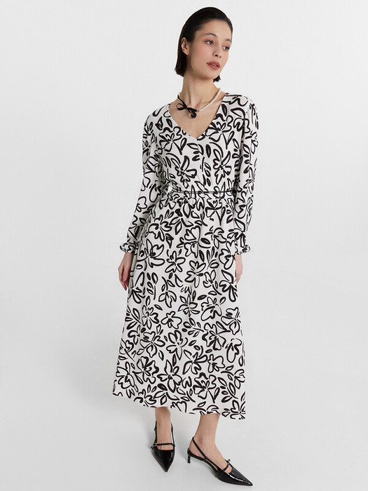 Платье полуприлегающего силуэта из ткани рошель. Горловина V-образной формы. Платье отрезное по талии, с эластичной тесьмой внутри. По эластичной тесьме проложены отделочные строчки. По детали переда средний шов. Детали спинки со средним швом. Рукав втачной, длинный. По окату слегка присборен. Длина рукава 3\4, по низу рукава настрочена эластичная тесьма которая делает сборку. Низ платья расширяется к низу. Длина платья ниже колена.