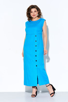 Платье А-силуэта. Горловина круглой формы с воротником стойкой. Плечо слегка спущено, рукав втачной, короткий. На детали переда вытачки. Спинка со средним швом и застежкой на потайную молнию. Нижний срез платья и рукавов обработан швом вподгибку на 2х игольной плоскошовной машине.