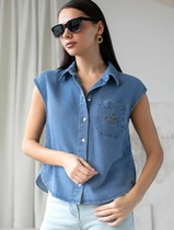22.03 Vilatte Укороченная блузка с коротким рукавом из джинсового лиоцелла D59.