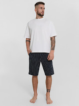 Шорты мужские прямого силуэта из трикотажного полотна футер. Пояс отрезной из основного полотна с эластичной тесьмой внутри. По поясу проложены отделочные строчки. По внутренней части пояса втавлен кругловязаный шнур. В боковых швах обработаны карманы с отрезным бочком, подкладка карманов кулирка.