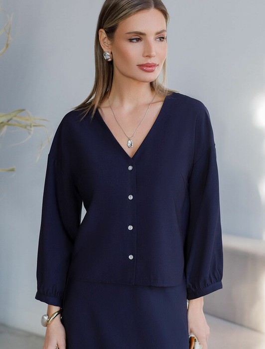 Элегантная укороченная блузка темно-синего цвета выполнена из плотного лиоцелла.  Лиоцелл это более дорогой и экологичный вариант вискозы, очень прочный и шелковистый. Ткань отличается от регулярной коллекции из лиоцелла - она содержит еще больше лиоцелла (92%), благодаря чему имеет более нежную шелковистую фактуру. Модель дополнена объемными рукавами длиной 7/8, создающими модный акцент. Укороченная передняя часть блузки выгодно подчеркивает линию талии, а удлиненная спинка обеспечивает комфорт. Этот асимметричный фасон придает образу динамичности, а V вырез визуально вытягивает силуэт. Свободный крой романтиной блузки не сковывает движений и отлично садится по фигуре даже на большие размеры, скрывая возможные недостатки. Эта легкая блузка с застежкой на пуговицы идеальный выборо для комфорта и стиля в теплое время года, она идеально адаптируется под любой повод.