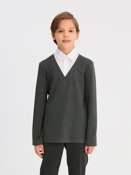 Джемпер трикотажный для мальчика прилегающего силуэта с имитацией манишки из сорочечной ткани контрастного цвета. Воротник отложной со стойкой. Укороченная застёжка на переде на планку с пуговицами. Рукава втачные длинные. Отличный вариант на каждый день.