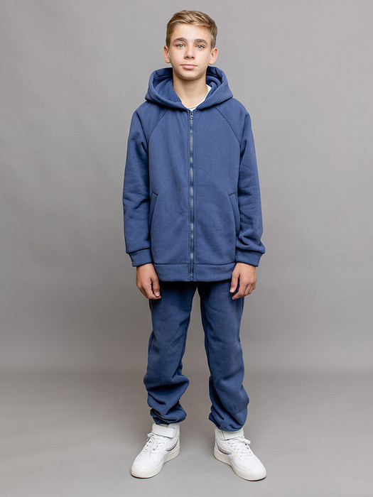 Комплект спортивный из футера с начесом синий для детей: толстовка на молнии и брюки. Ткань не линяет, не выцветает. Толстовка с карманами, глубоким капюшоном и эластичными манжетами рукавов. Брюки с поясом на резинке и утяжке шнурком, карманами и эластичным низом. Удобный базовый комплект одежды. Характеристики:Ткань верха: футер 3-х нитка с начесом65% хлопок, 35% полиэстерПроизводитель: Batik
