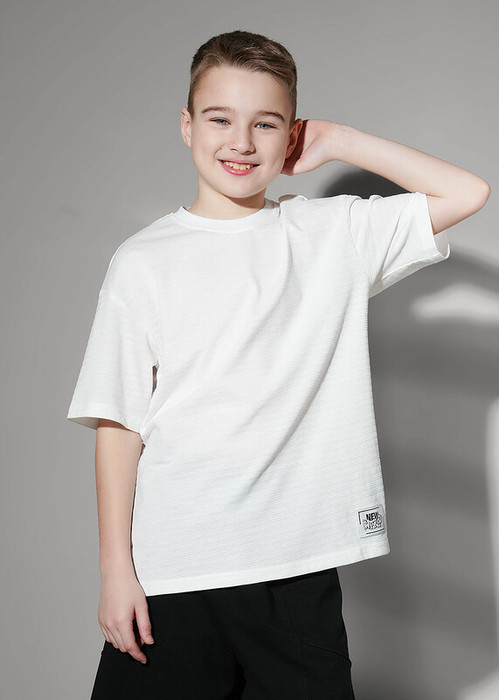 Лёгкая летняя футболка из ажурного трикотажа с воздушным плетением. Свободный крой, круглый вырез. По низу — стильная нашивка. Идеально для подростка: комфортно, модно, пропускает воздух.