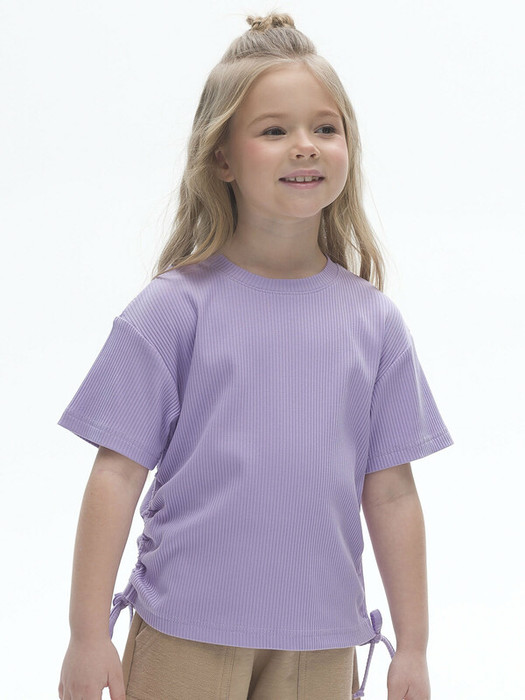 Футболка из модной ткани в рубчик для девочки. Благодаря преобладающим в составе хлопку и вискозе ткань изделия дышит и приятна на ощупь.  Эластан помогает сохранять форму. По бокам модели кулиски с тесьмой — актуальный тренд. С их помощью можно делать стильную сборку с одной или двух сторон. Такая футболка хорошо сочетается с различными шортами, леггинсами, кюлотами или джоггерами.