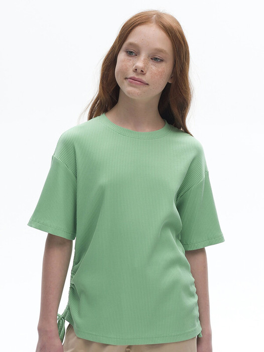 Футболка из модной ткани в рубчик для девочки. Благодаря преобладающим в составе хлопку и вискозе ткань изделия дышит и приятна на ощупь.  Эластан помогает сохранять форму. По бокам модели кулиски с тесьмой — актуальный тренд. С их помощью можно делать стильную сборку с одной или двух сторон. Такая футболка хорошо сочетается с различными шортами, леггинсами, кюлотами или джоггерами.