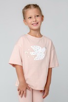 Детская футболка для девочки. Модель прямого кроя, выполнена из эластичного хлопкового трикотажа джерси. Спереди - крупный красочный принт. Горловина круглая. Рукава-крылышки.